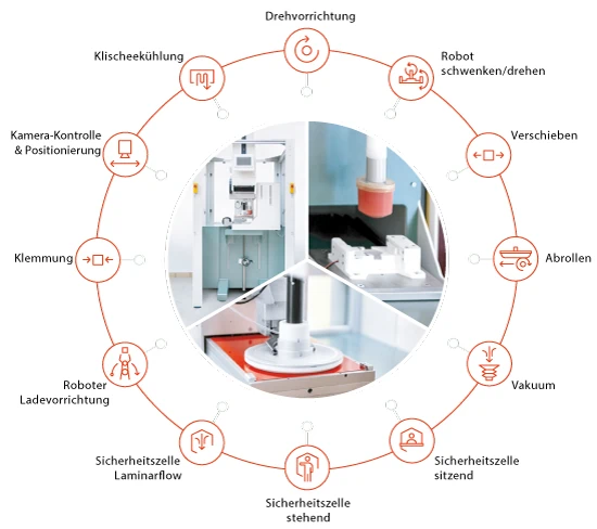 Für das selbstständige Arbeiten in einer Anlage empfehlen wir mindestens die Tamponreinigungsüberwachung und den Viskomaten. Für höhere Ansprüche in der Produktionssicherheit bieten wir zudem die Füllstandsanzeigen für beide Einheiten, sowie weitere Sensoren für Temperatur und Luftfeuchtigkeit. Eine Klischeekühlung vermindert den Temperatureinfluss auf Farbübertragungs- und Topfzeit. Sicherheitszellen können speziell für Steharbeits- oder für Sitzarbeitsplätze gestaltet werden. Sie können zusätzlich mit einem Rundschaltteller versehen und zur Staubminimierung mit einem Laminarflow ausgestattet werden. Ein Barcode Reader vereinfacht und beschleunigt den Einrichteprozess.