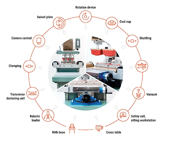 integrated into a system. As it is possible to mechancally position the machines internally, they can also be used in systems without a cross table. Autonomous operation is ensured through monitoring of the cleaning belt and the microPrint Viscomat. The retractable pad printing head enables easy loading of the machine by robot. The print object can be turned or rolled either electrically or pneumatically. For printing longer images, either an oval cup or a transverse doctoring unit can be used.
