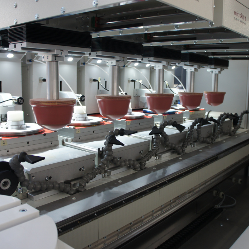 La série Modul est généralement utilisée dans des installations. Elle convient aux pièces comportant de nombreuses images imprimées en différentes positions, ainsi qu’à l’impression de différentes variantes dans un même travail d’impression. Pour les applications nécessitant des temps de cycle courts et une grande précision. Plusieurs unités sur un système de transport peuvent imprimer en parallèle de très grandes quantités de pièces en plusieurs couleurs. Grâce à un entraînement linéaire avec un logement combiné à un dispositif de rotation, il est possible d’imprimer des pièces grandes et complexes en une seule séquence. Pour les processus d’impression sensibles (p. ex. pour l’électronique imprimée, l’impression étanche à la lumière ou translucide), nous recommandons la course électrique du tampon.