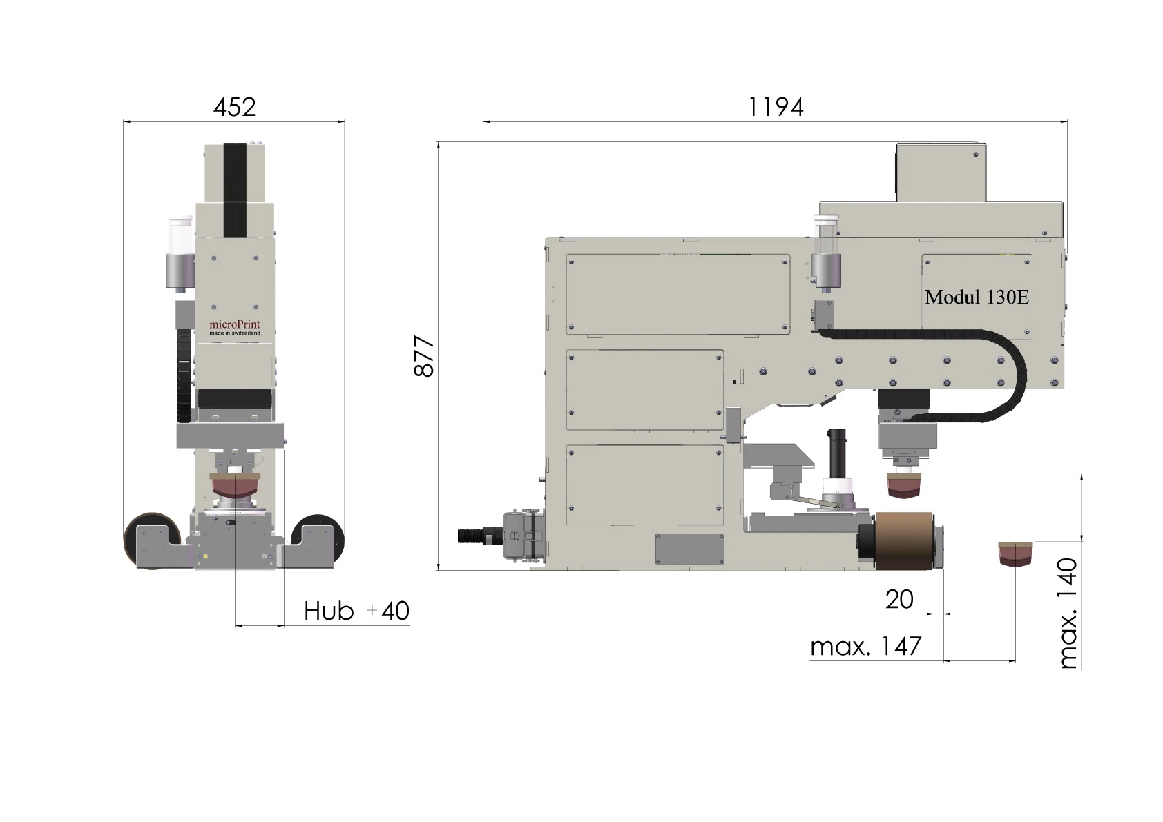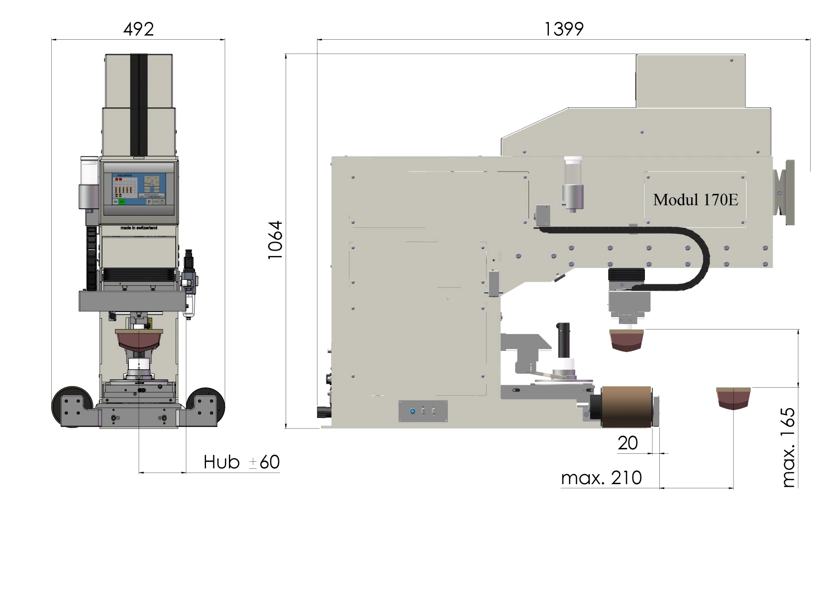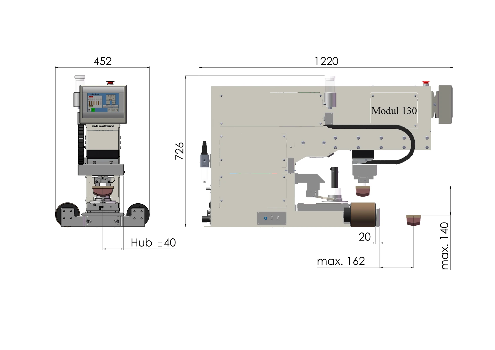Les positions X et Y des tampons sont rejointes par des moteurs linéaires. Elles sont réglées par pas de 0,01 mm via l’écran d’affichage. La course du tampon peut être entraînée, au choix, de manière pneumatique, ou bien électrique par un servomoteur et des broches. La vitesse de la course pneuma-