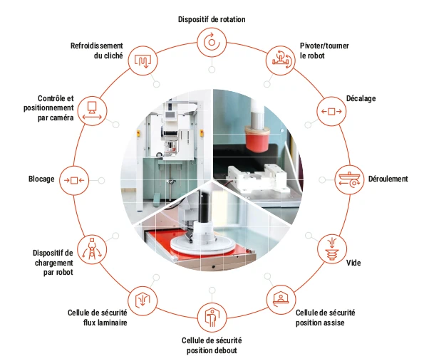 l’intégration du pré-traitement et du post-traitement, d’une surveillance et d’un positionnement par caméra ou d’un chargement par robot.